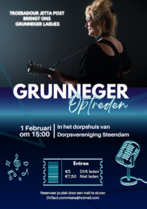 Troebadour Jetta Post brengt ons Grunneger laidjes in het dorpshuis van Dorpsvereniging Steendam. Entree € 5,00 voor DVS leden en € 7,50 voor niet DVS-leden. Reserveer je plek door een mail te sturen naar DVSact.commissie@hotmail.com.