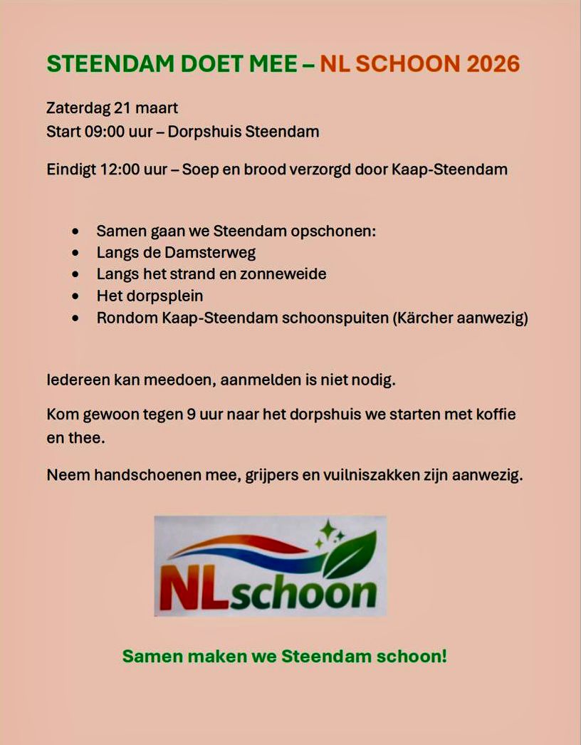 Op zaterdag 21 maart aan we Steendam opschonen langs de Damsterweg, langs het strand en de zonneweide, het dorpsplein en rondom Kaap schoonspuiten (Kärcher aanwezig).